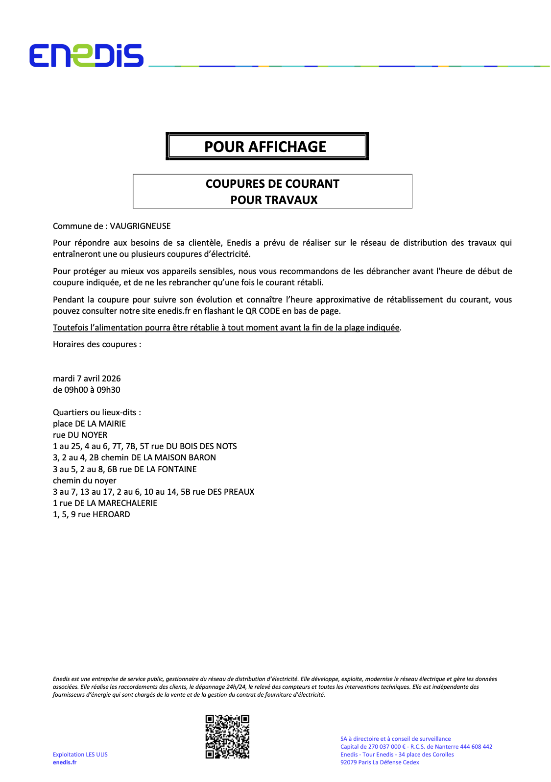 Enedis vous informe d'une coupure de courant pour travaux concernant la commune de VAUGRIGNEUSE mardi 7 avril 2026 entre 09h00 et 09h30.
