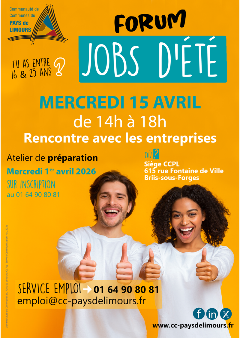 Le service emploi de la Communauté de Communes du Pays de Limours (CCPL) organise le Forum des jobs d’été, à destination des jeunes de 16 à 25 ans.