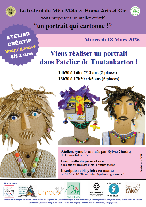 Dans le cadre du 30e festival Méli-Mélo, Sylvie Gindre, via son association « Home-Art & Compagnie », propose à vos enfants de 4 à 12 ans un atelier créatif le mercredi 18 mars, de 14h30 à 16h00 ou de 16h00 à 17h30.
